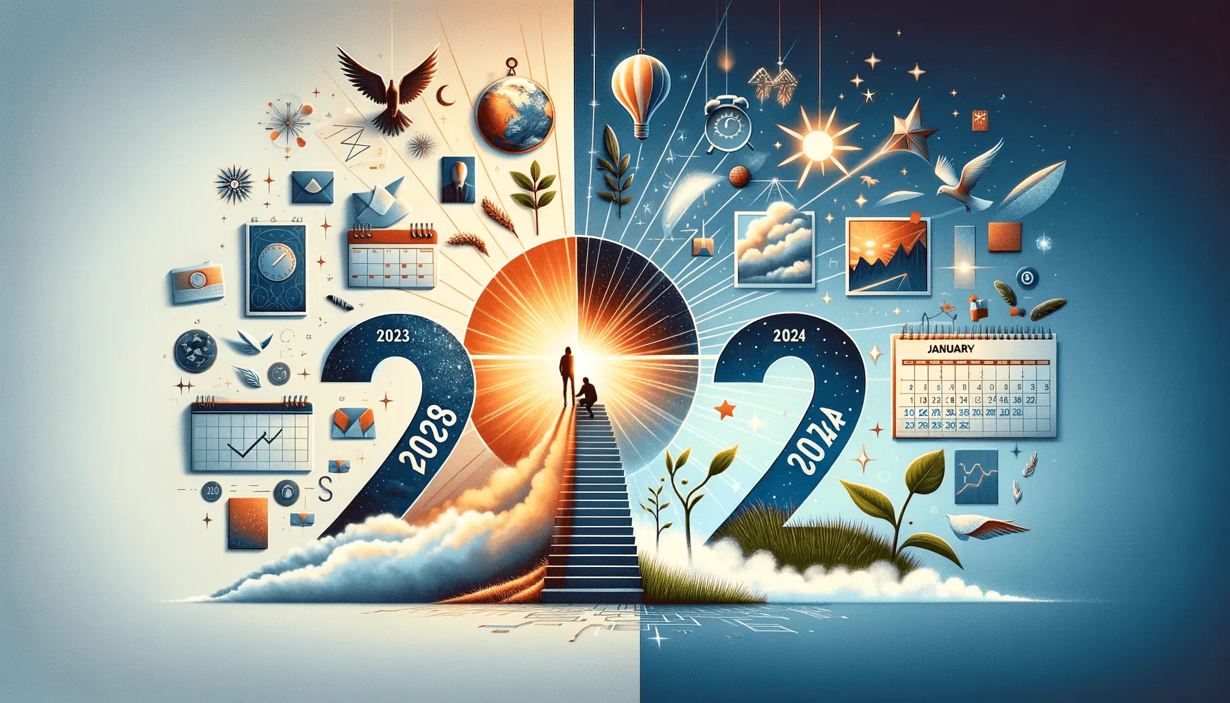 A visually appealing and symbolic thumbnail for a blog article titled ‘Reflecting on 2023 and Goals for 2024’. The image features a split design: the left half represents 2023 with visuals like a calendar page showing December 2023, and icons or images symbolizing major events or trends of the year. The right half represents 2024 with images like a rising sun, a blank calendar page for January 2024, and symbols of hope and aspiration like a seedling growing or a person climbing steps towards a star. The split is creative, with elements blending into each other, conveying transition and evolution.