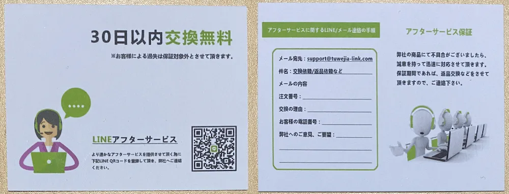 やたらレビューが多く、わりと評価が良いように見えますが、これは販売元がレビューをお願いしているからです。購入した商品には、返品に関する情報とレビューを書くと謝礼を渡す、といった文章が書かれた紙が入っています(写真は表と裏)。