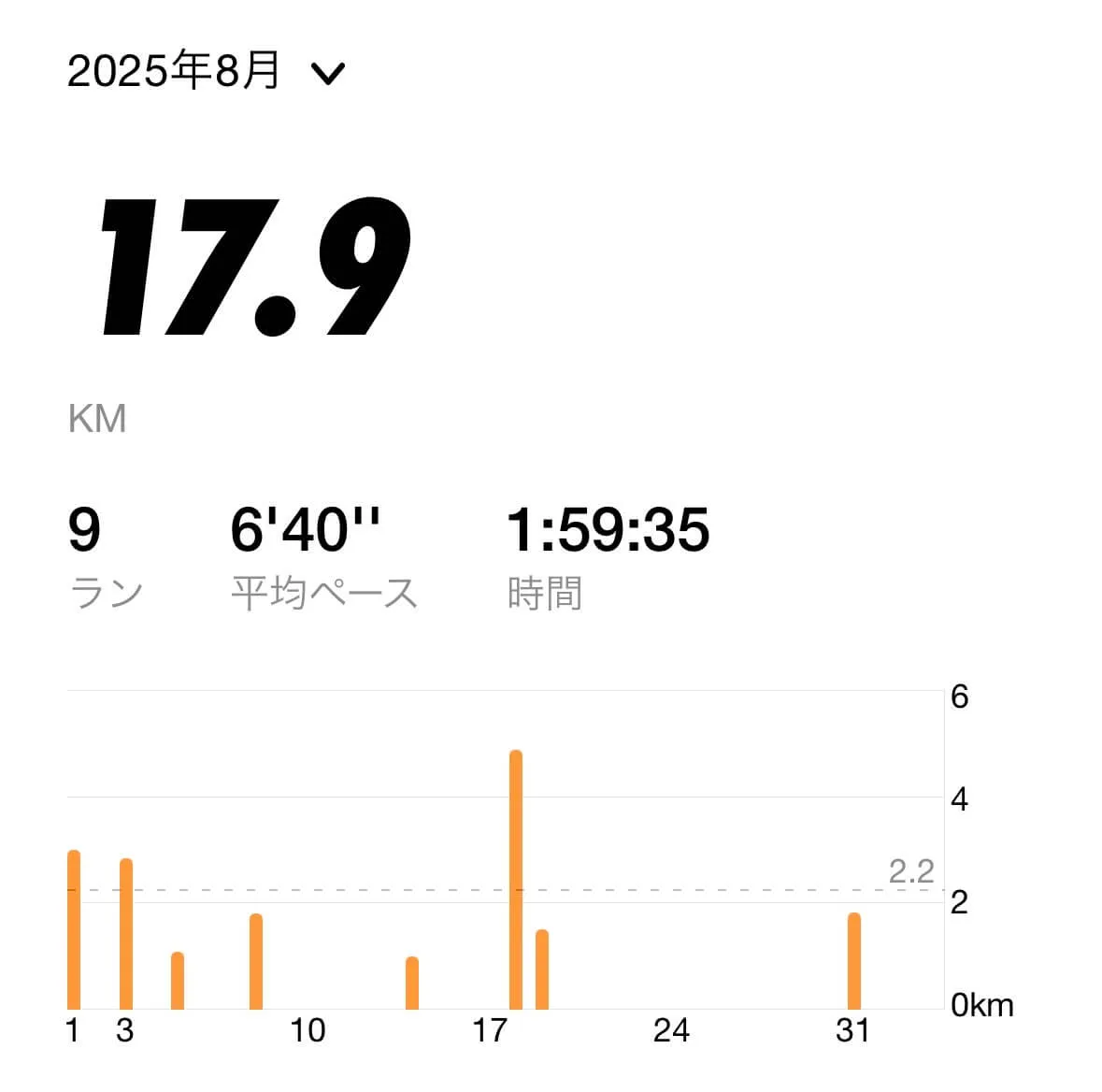 この調子で走行距離を伸ばしていけば良かったのですが、8月に入ってから練習する時間が取りにくくなり、ランニングの頻度が激減してしまいました。