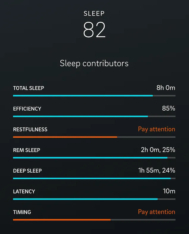 自分の場合だと、毎回睡眠の快適さ(Efficiency※追記:Restfulness でした。)の値が低いので、寝るときに使っている寝具を変えたほうがいいのかな?などと思わされます。