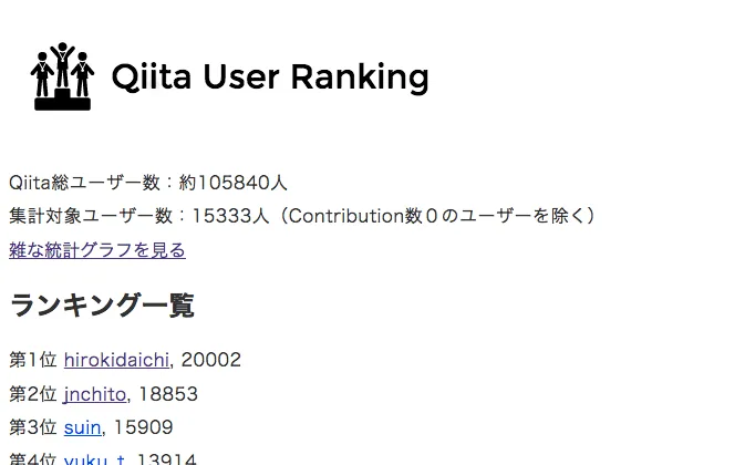 実際のところ、少し調べるとQiita Contribution ランキング 公開 もっとも貢献度が高い人は? – プログラミング生放送という記事は見つけたのですが、該当サイトは現在データが表示されておらず、ランキングを見れない状況にあったため、独自に作りました。