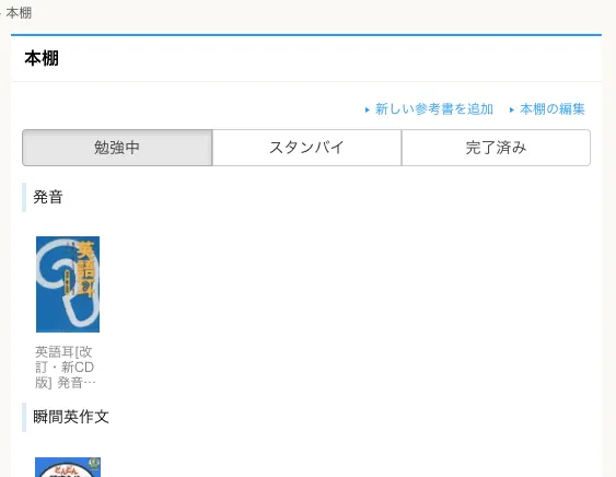 また、登録した教材は「本棚」というページに一覧表示されるが、これを「勉強中」「スタンバイ」「完了済み」に移動することもできる。