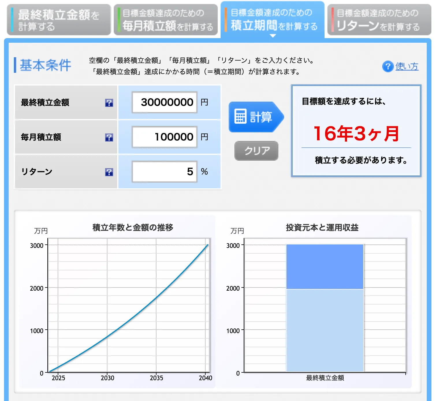 ちなみに、運用リターンを仮に年 5%とおき、月に 10 万円ずつ投資して 3000 万円になるまでにかかる期間は約 16 年 3 ヶ月です。
