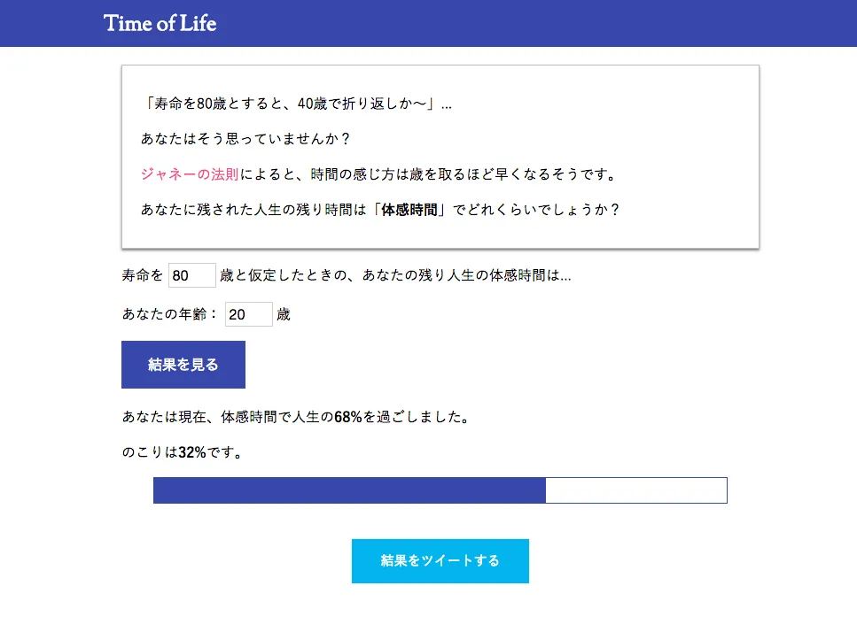 そこで、試しに自分の年齢を入力することによって、体感時間的に自分が人生のどの割合まで来ているのかが簡単にわかる Web アプリを作ってみることにしました。
