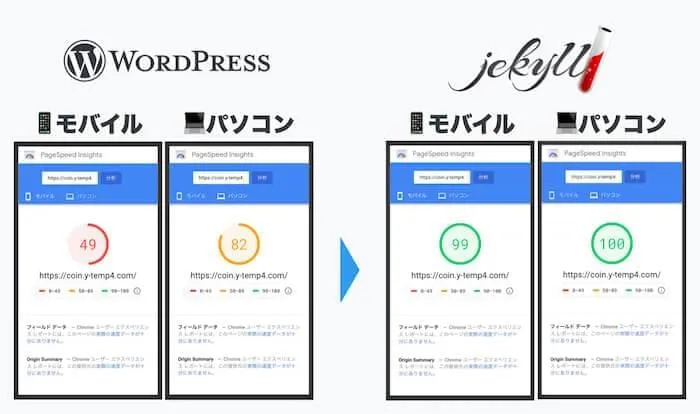 まぁ動的サイトと静的サイトの比較なので当たり前なんですが、移行後のほうが速くなって嬉しいです。